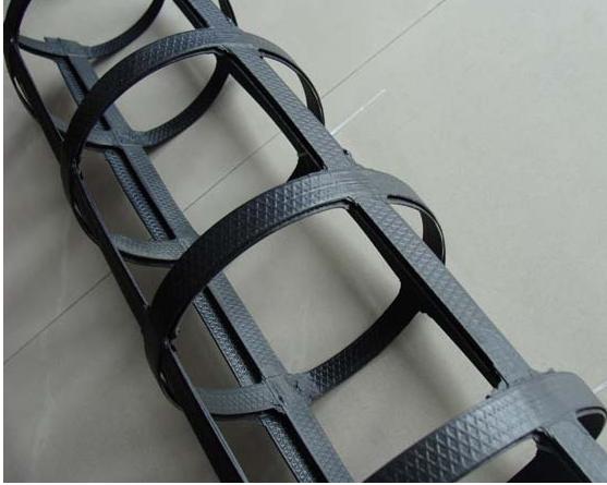 鋼塑土工格柵在瀝青路面中起到骨架作用的作用。瀝青混凝土中的集料貫穿網格,形成復合機械鎖緊系統,限制集料運動,增加瀝青加鋪層中的側向約束力,在瀝青加鋪層中相互約束,防止瀝青加鋪層移動,從而達到作用抗車轍。